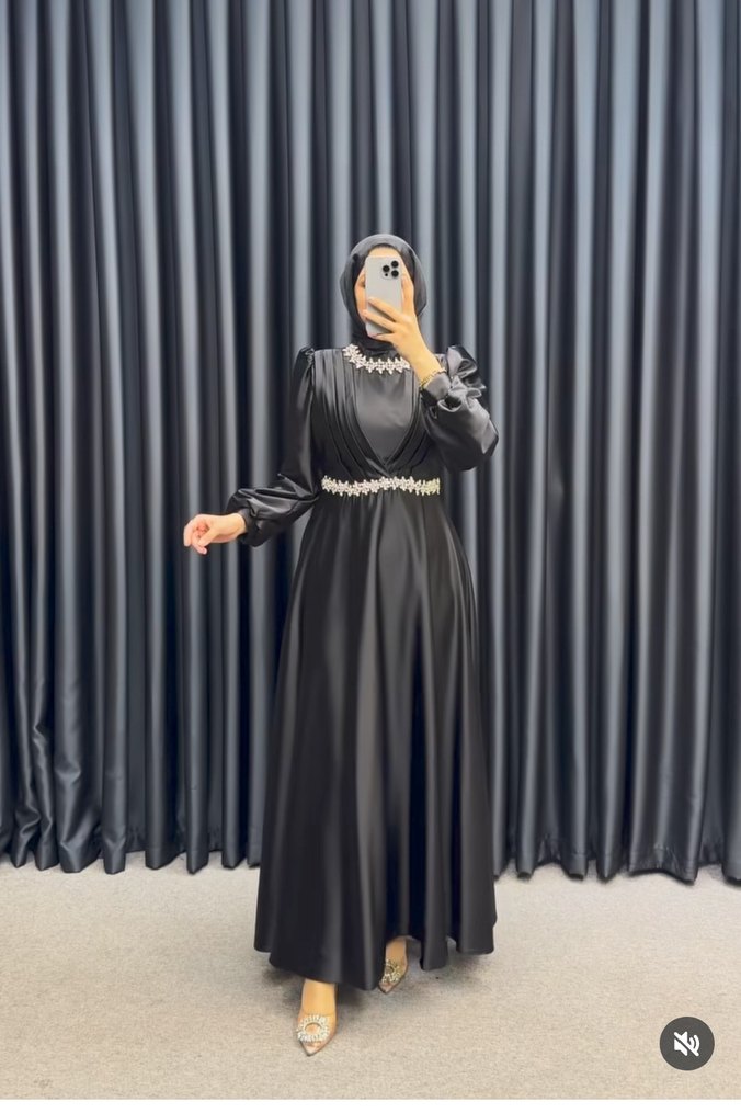 Normal bedenim 46 ama elbise 42beden,olarak üretilmiş Yüksek yakalı ve uzun kollu siyah uzun abiye elbise, bol kesim ve drapeli detaylara sahiptir. Bel ve yakada beyaz süslemeler bulunur, gotik ve mütevazı tarz için uygundur