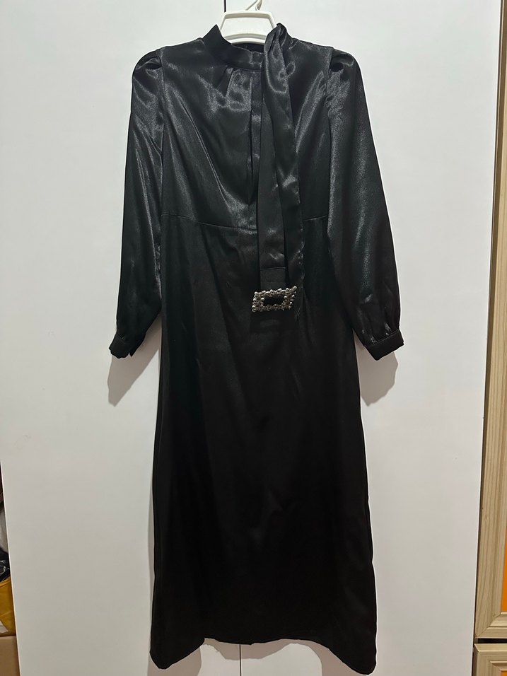 Siyah, parlak kumaştan, drapeli ve ince askılı, halter yakalı uzun ve vücuda oturan gotik abiye elbisedir.