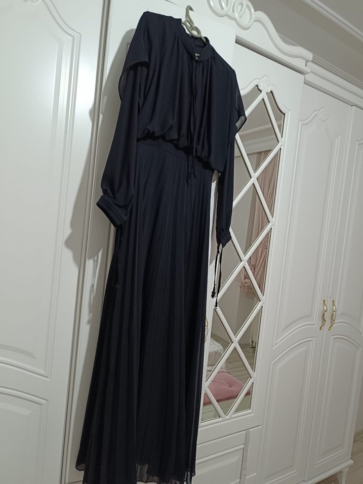Siyah uzun elbise, drapeli tasarım ve bol kesim ile strappy kollara sahiptir. Tek renk, tekne yaka ve yumuşak sentetik kumaştan yapılmıştır, gotik stilinde ofis için uygundur.