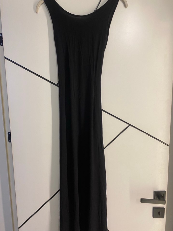 Siyah, uzun, drapeli ve kolsuz bu elbise, tek düze ve gotik tarzda, tekne yaka ile şık bir görünüm sunar.