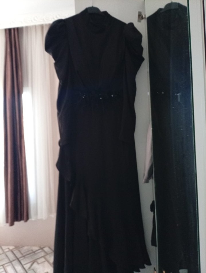 Siyah uzun elbise, drapeli tasarımı, kesik yaka ve kolsuz kesimiyle dikkat çeker. Sentetik kumaştan, düzenli kesimlidir. Gotik ve yenilikçi tarzlar için uygundur.
