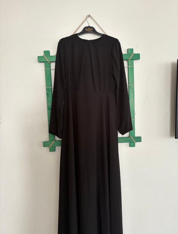 Siyah uzun elbise, yüksek yakalı ve askılı kolludur. Drapeli tasarıma ve regular kesime sahiptir, sentetik kumaştan üretilmiştir, ofis kullanımı için uygundur.