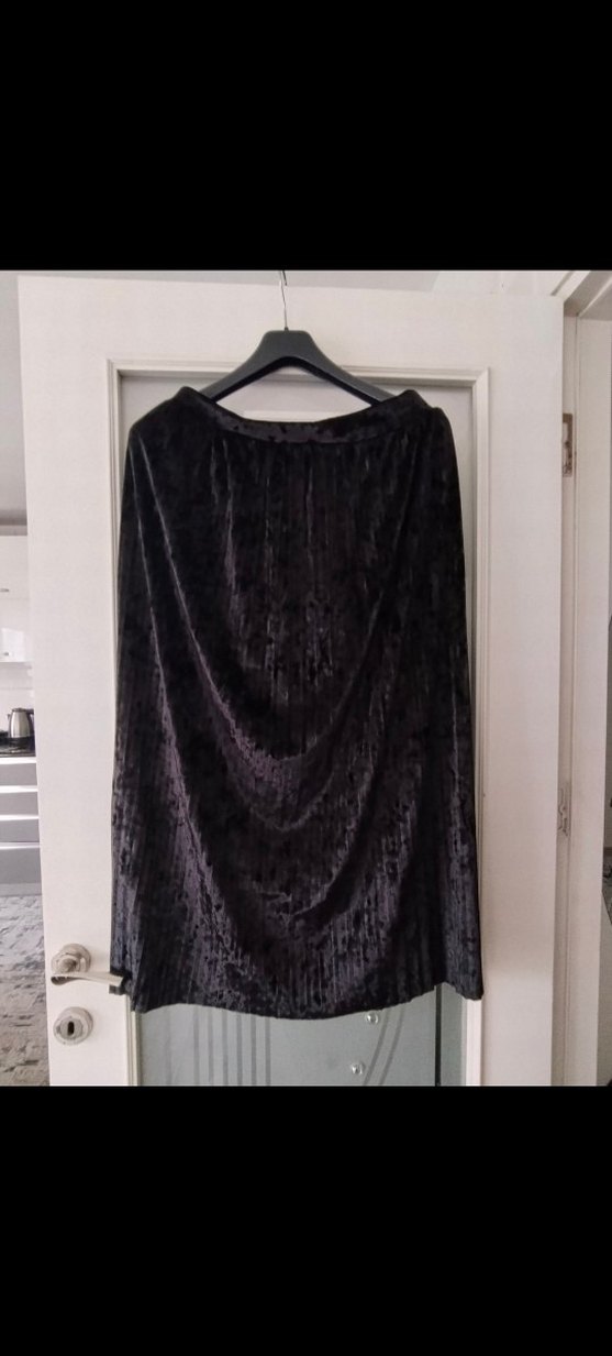 Siyah uzun drapeli etek, yumuşak sentetik kumaştan ve bol kesimlidir. Gotik ve bohem tarzlar için uygundur, partiye uygun.