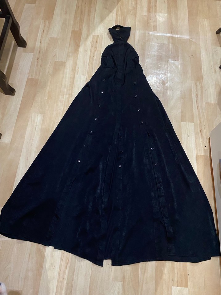 Siyah renkte, yüksek yakalı ve kolsuz uzun hamile kabanı. Sentetik kumaştan, drapeli ve bol kesim modelde gotik tarzda tasarlanmıştır. Rıse&warm marka orjinal bi sefer giyildi galada