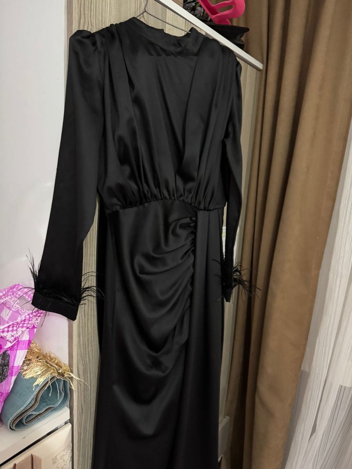Siyah, drapeli ve tüy detaylı uzun kollu, vücuda oturan gotik tarzda kadın abiye elbisedir. Parti için uygundur.