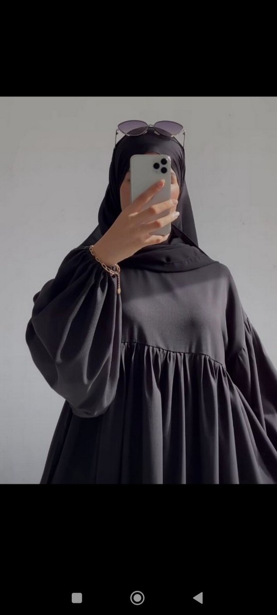 Siyah uzun elbise, yüksek yakalı ve uzun kollu olup, bol kesimdir. Medine ipeği kumaşı