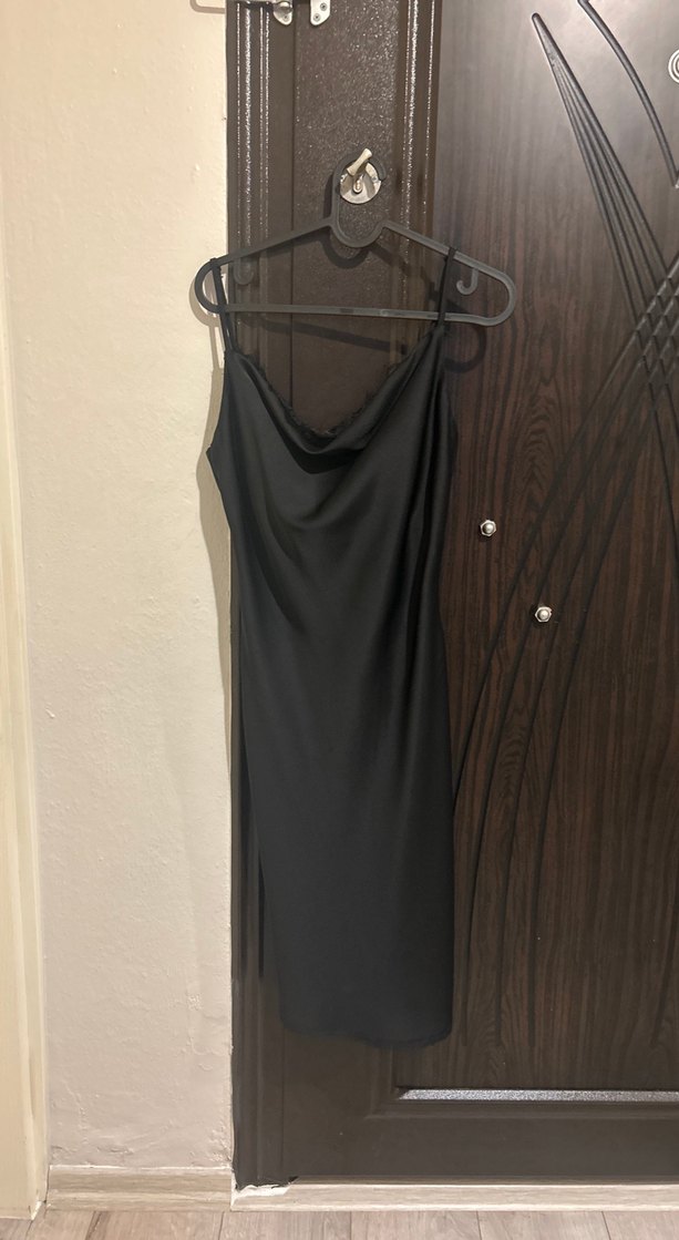 Siyah uzun elbise, drapeli kayık yaka ve ince askılara sahiptir. İpeksi dokusuyla minimalist gotik tarzda, romantik akşamlar için uygundur.