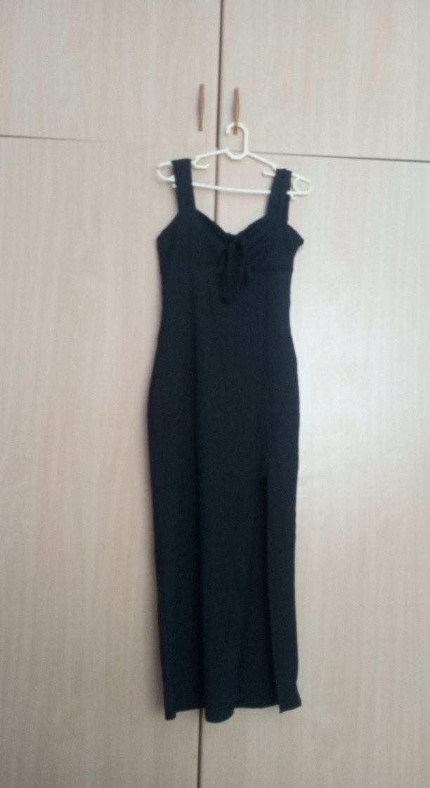 siyah uzun, ince askılı ve v yaka, drapeli detaylı, klasik şıklıkta dar kesim elbise.