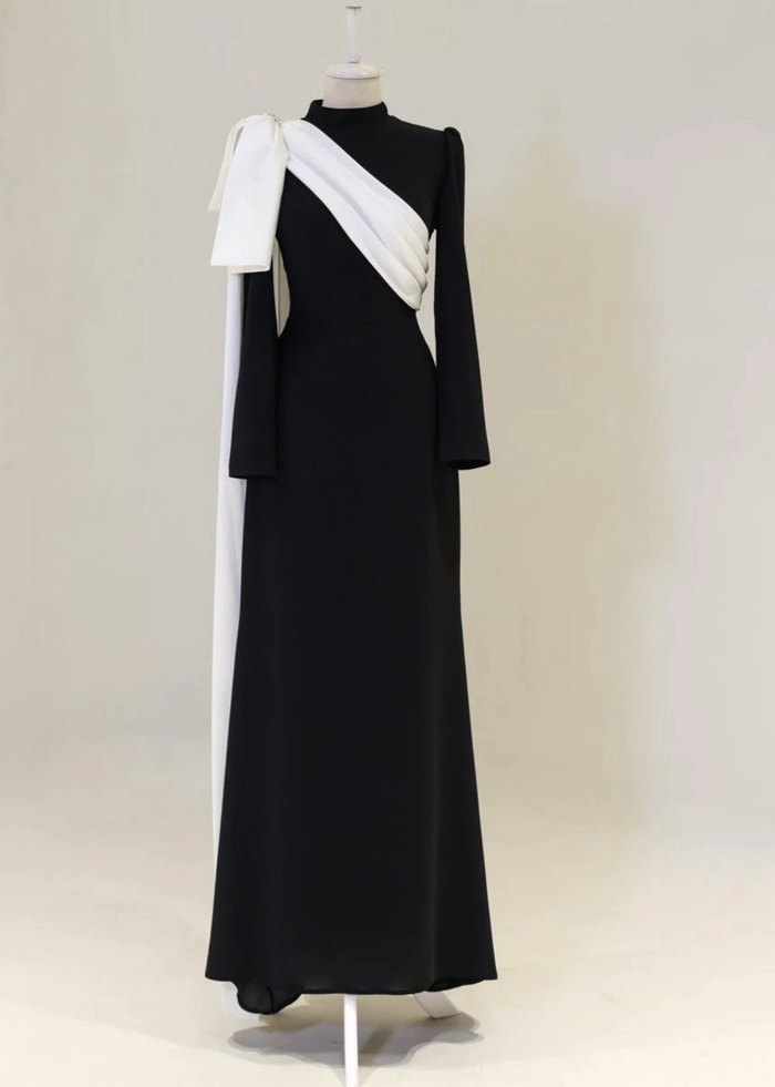 Siyah uzun abiye elbise, yüksek yakalı ve beyaz drapeli detaylarla klasik ve çağdaş avant-garde tarzı bir araya getirir. Rahat kesim ve sentetik kumaştan üretilmiştir. 40 beden 155cm boy Benim boyum 160cm kilo 63