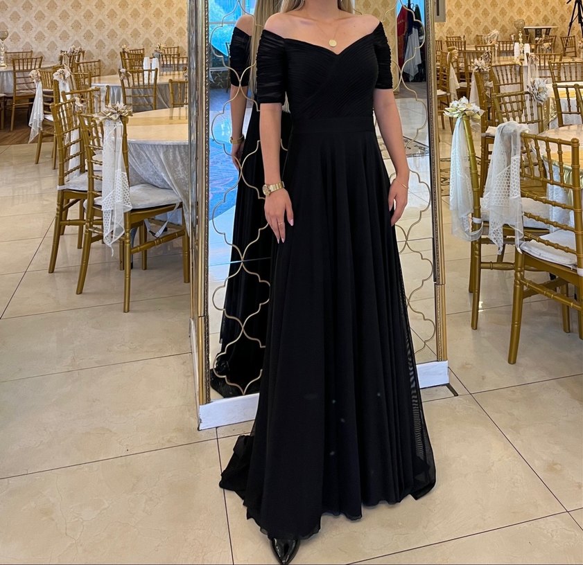 Siyah uzun abiye elbise, drapeli tasarım ve kayık yaka ile strappy kollara sahiptir. Düz ve klasik kesim, düğünler için uygundur.