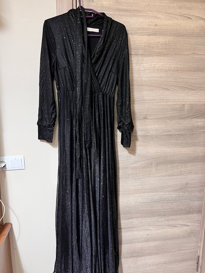 Siyah uzun abiye elbise, drapeli. V yaka ve manşetli uzun kolludur, bi kolunda hafif tüylenme var onun dışında sorun yok hiç giymedim