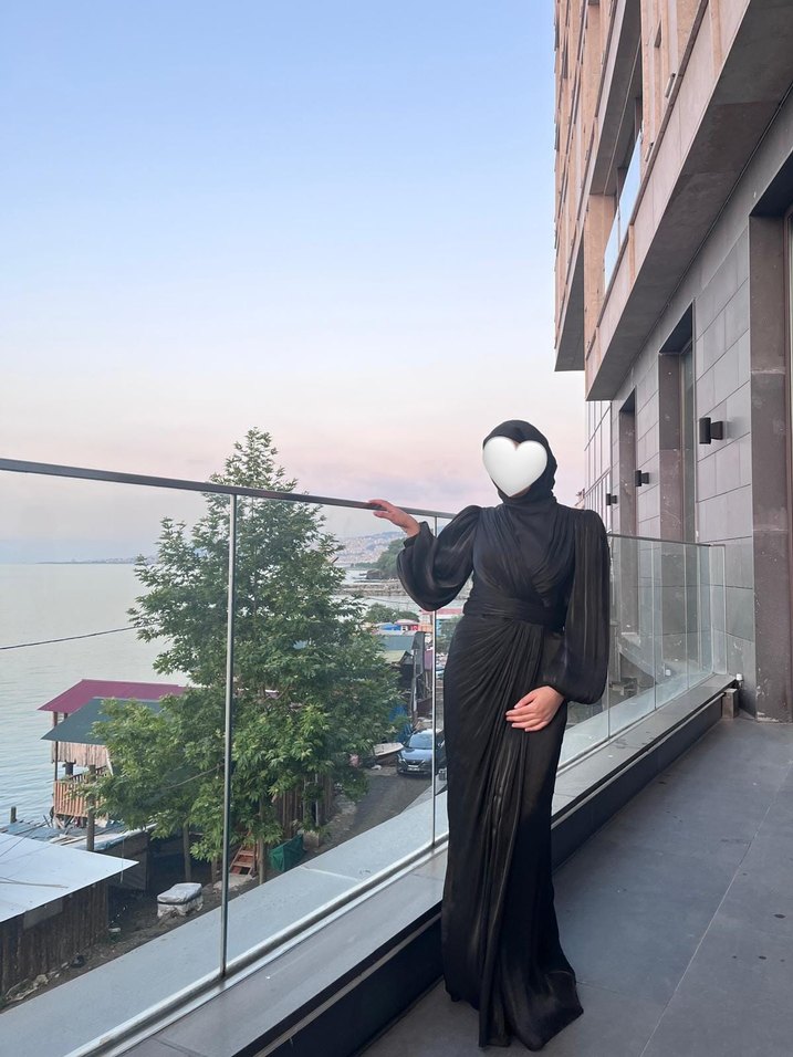 Siyah, uzun kollu, yüksek yakalı ve drapeli tasarıma sahip uzun abiye.