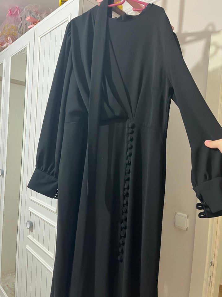 Siyah uzun elbise, yakasında kesik detay ve düğmeli manşetli uzun kollara sahiptir. Rahat kesim ve drapeli tasarımla, düğünlük elbisedir