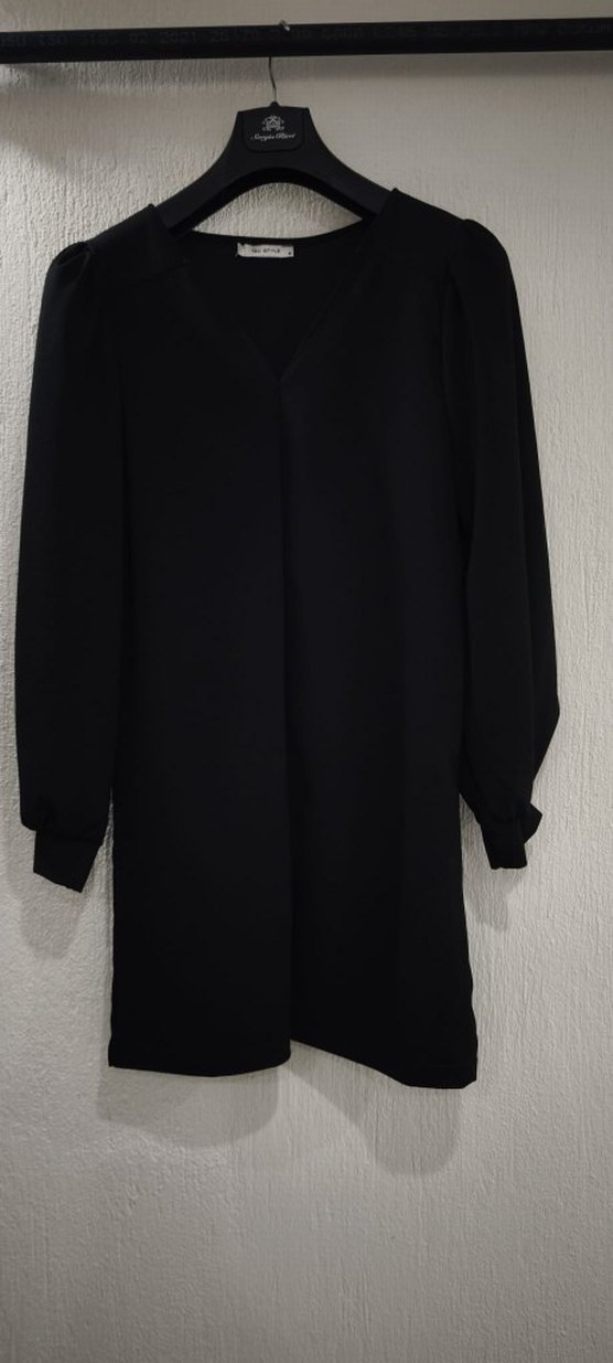 Siyah renkli, uzun boylu, drapeli detaylara sahip kadın elbise. Uzun kollu, yüksek yakalı ve regular fit kesimlidir. Ofis için uygun, sade ve pürüzsüz dokulu.Balon kol
