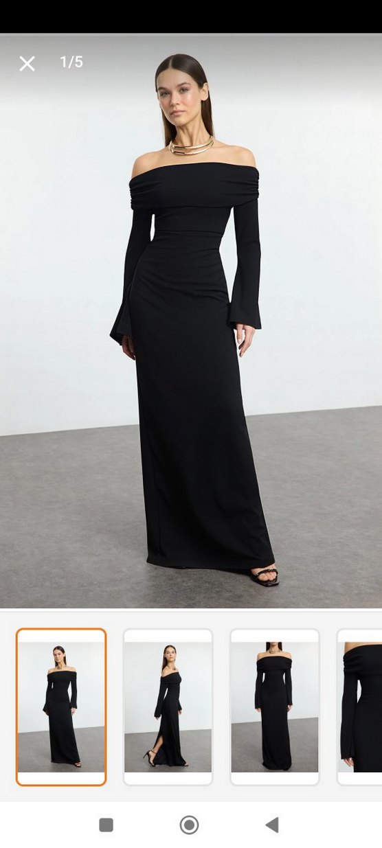 Siyah uzun elbise, drapeli tasarımı, tekne yaka ve uzun kolludur. örme kumaştan, klasik ve minimalist tarzda Carmen yaka