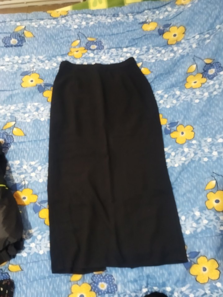Siyah renkte, drapeli tasarıma sahip, yumuşak ve sıcak kumaştan yapılmış uzun etek. Minimalist ve rahat stil için uygundur. arka yirtmacli