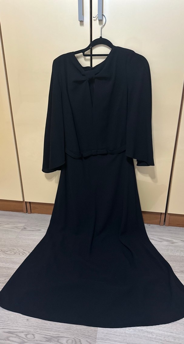 Siyah uzun elbise, ipeksi kumaş, drapeli tasarım ve kesik yaka detayıyla. Uzun kollu, düzenli kesim, minimalist gotik tarz için uygun.