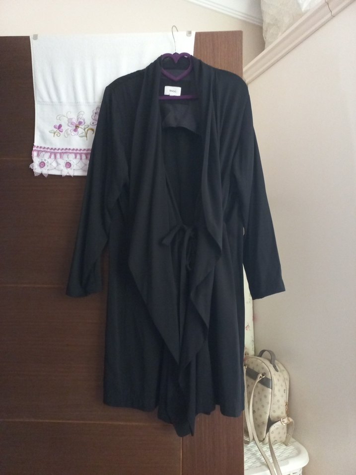 Siyah uzun drapeli kadın tunik, notched lapel yakalı ve bol kesimdir. İpek gibi kumaştan yapılmış, uzun kollu ve minimalist gotik tarzda, ofis için uygundur.