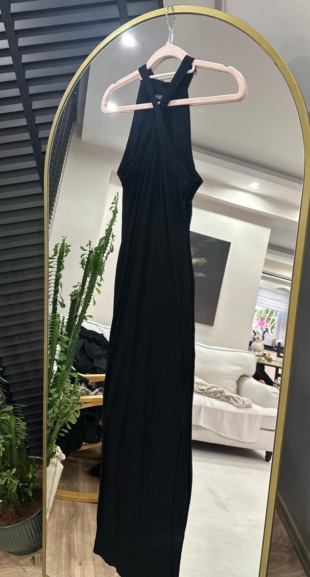 Drapeli detaylara sahip, kolsuz ve yüksek yakalı siyah uzun elbise. Düz ve şık sentetik kumaştan, gotik tarz ve romantik akşamlar için uygundur. Yırtmaçlı dar