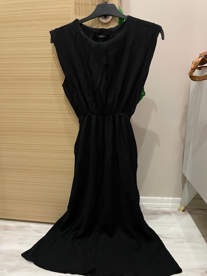 Siyah uzun elbise, drapeli ve kolsuz tasarımıyla dikkat çekiyor. İnce kesimli, satenimsi kumaştan ve yuvarlak yakalıdır. Ofis için uygundur. Koltuk altından itibaren 91 cm