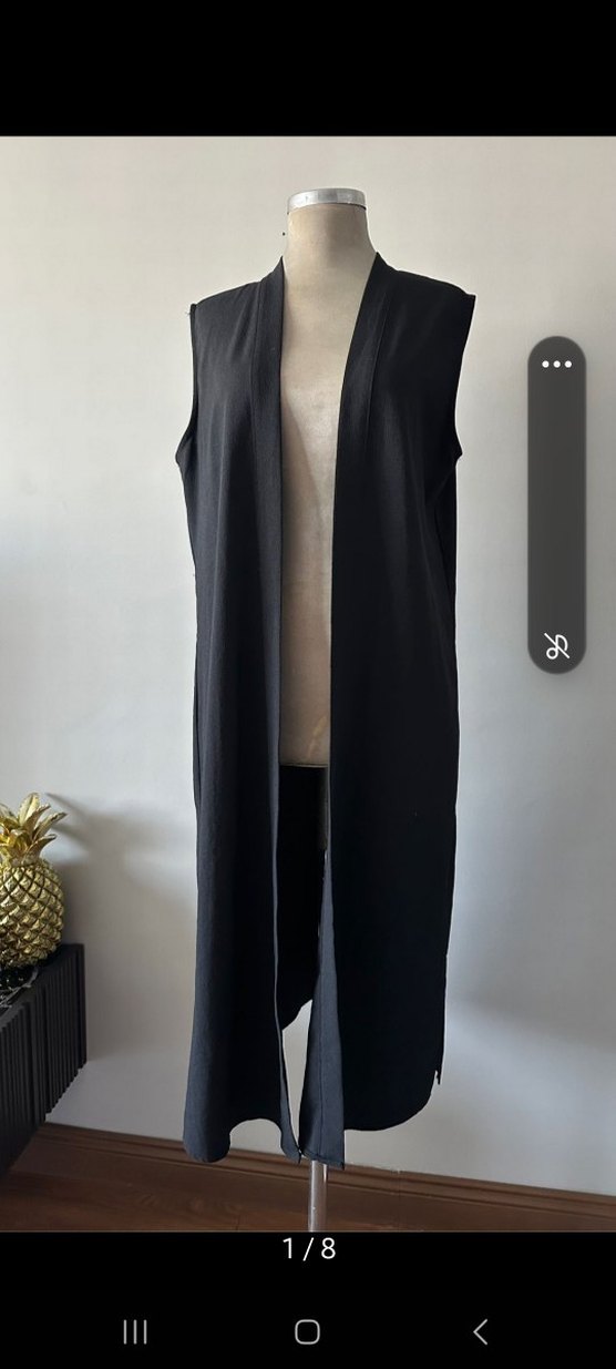 Siyah, kolsuz, uzun kadın yelek. Notlu yaka ve drapeli tasarıma sahip, ipek gibi dokulu kumaştan üretilmiştir. Ofis için uygun minimalist tarzda, regular fit.