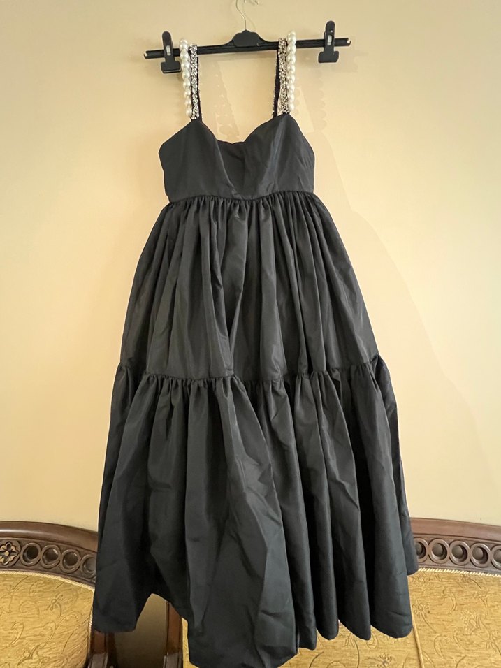 Siyah, uzun, bol kesim ve drapeli tasarıma sahip elbise. Straplez ve dekoratif askılı, gotik tarz ve düğünler için uygun. Hiç kullanılmamıştır etiketi mevcuttur