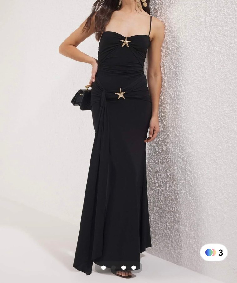 Siyah uzun elbise, ince askılı ve drapeli detaylara sahiptir. Straplez yakası ve yıldız süslemeleriyle romantik akşamlar için uygundur. Sentetik, pürüzsüz kumaştan yapılmıştır.