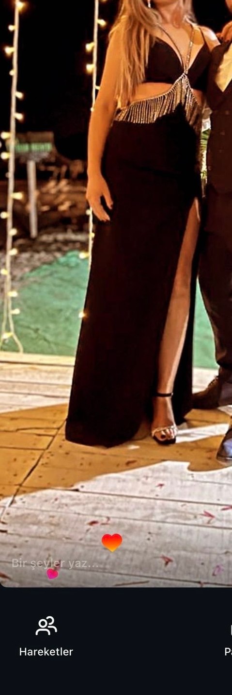Siyah uzun, drapeli ve fit kesim abiye elbise, strappy askılar ve yırtmaç detayına sahiptir. Notched lapel yaka ile gotik düğünler için uygun. 1 kez giyildi