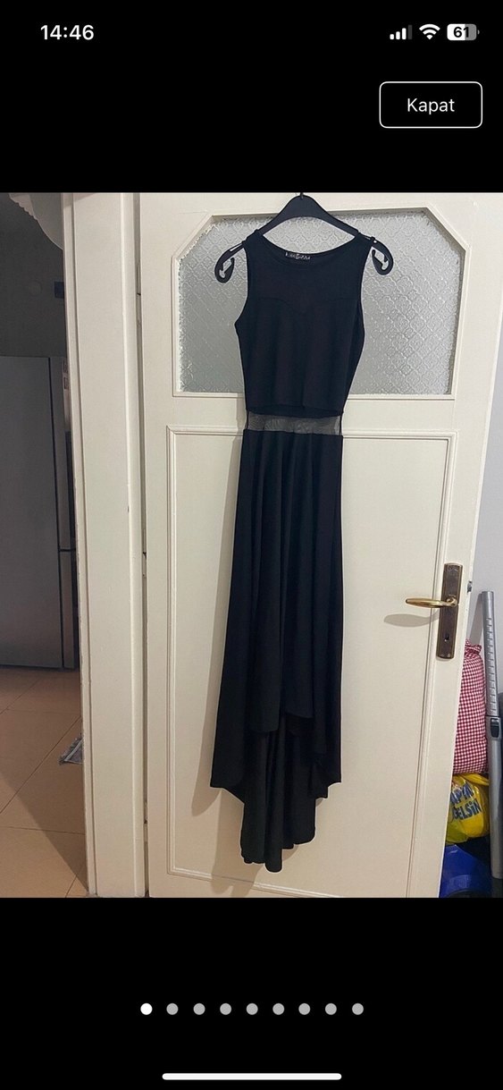 Siyah uzun elbise, V yaka ve askılı kollara sahip, vücuda oturan kesimiyle dikkat çeker. Pürüzsüz sentetik kumaştan olup drapeli tasarıma sahiptir. Gotik tarzda şık bir seçimdir.
