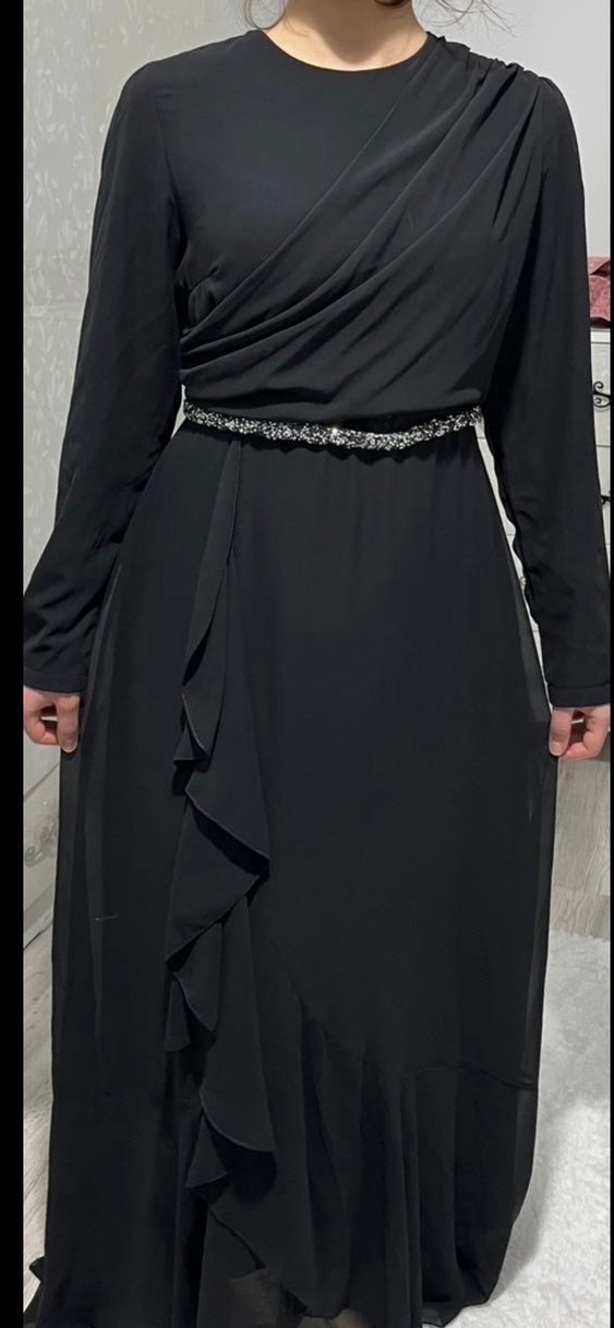 Siyah uzun abiye elbise, drapeli belde zarif süslemeye sahiptir.