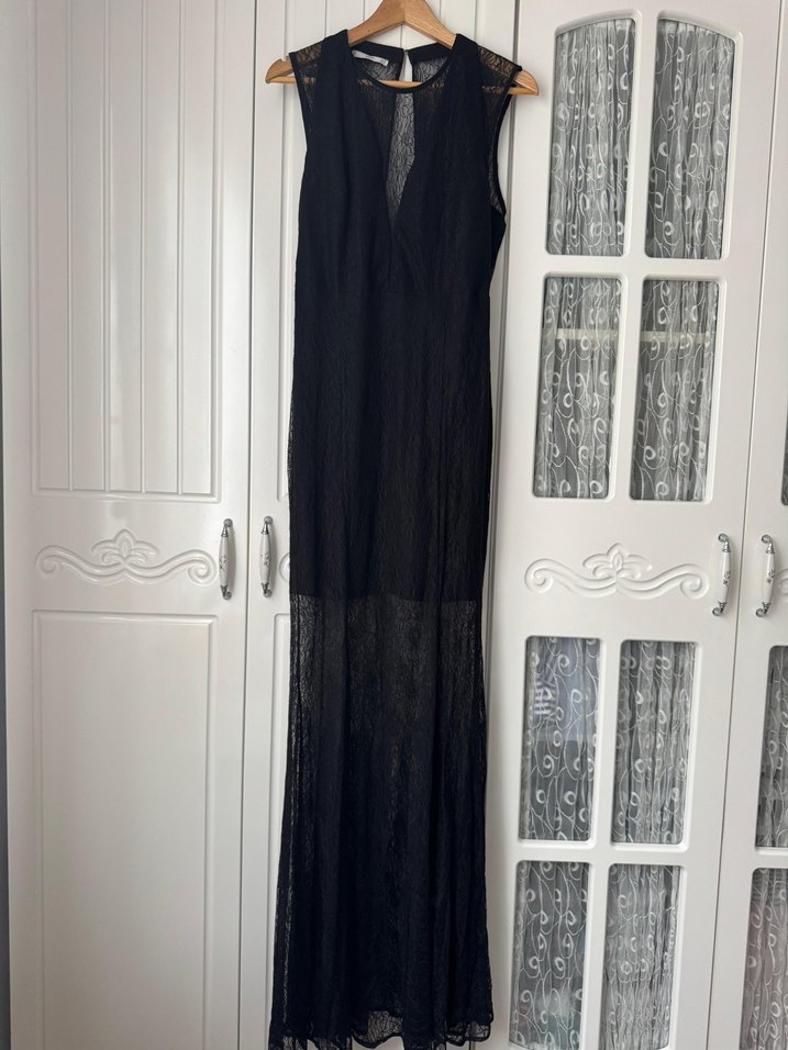 Siyah renkte, v yakalı ve drapeli tasarıma sahip, sentetik kumaştan üretilmiş kolsuz uzun elbise. Düzenli kesimiyle gotik stile ve romantik buluşmalara uygundur.