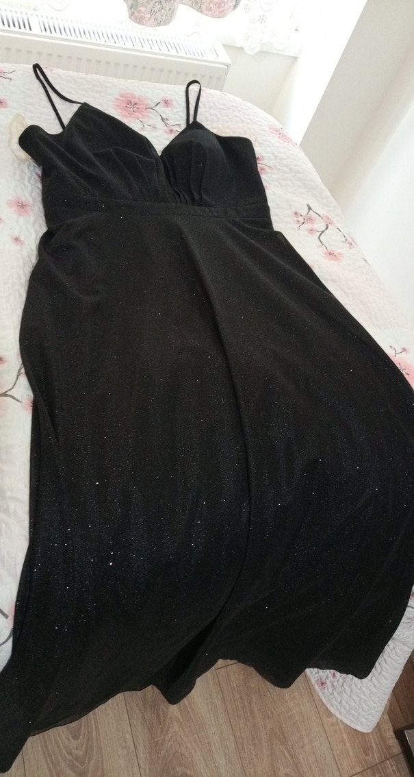 Drapeli tasarıma sahip, askılı kolları ve V yakası olan siyah, uzun ve vücuda oturan abiye elbise. ✨