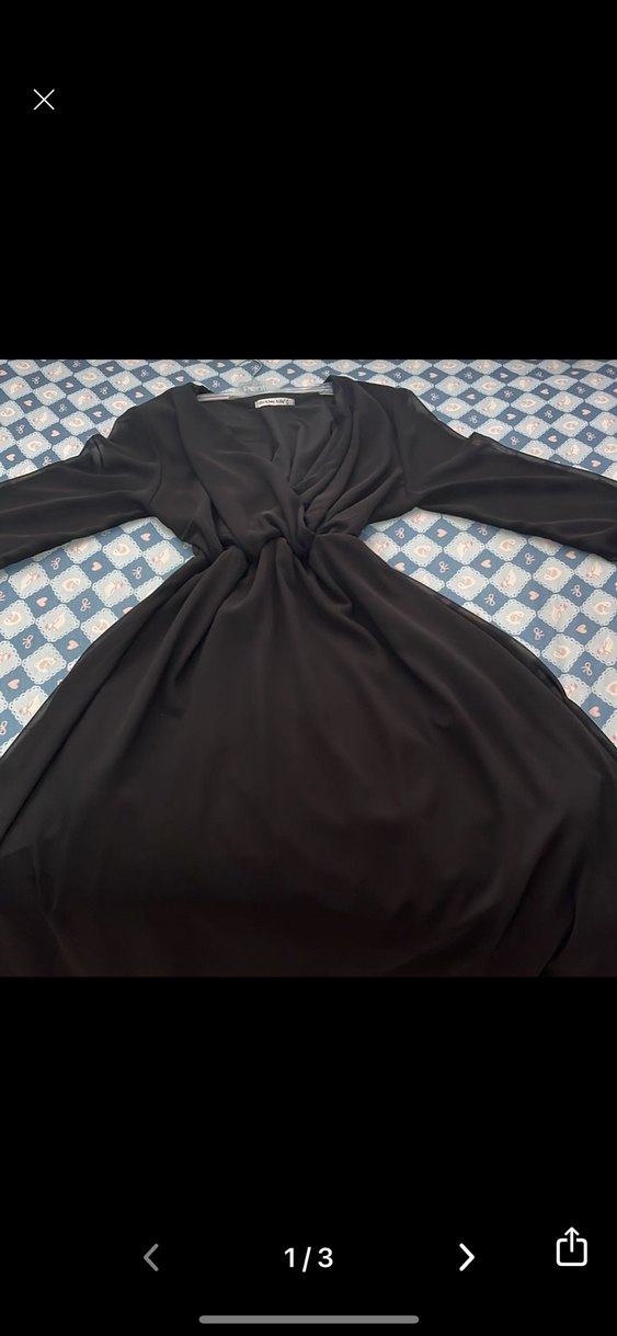 Siyah uzun elbise, drapeli tasarımı ve V yakasıyla dikkat çeker. Uzun kollu ve bol kesimdir, yumuşak sentetik kumaştan üretilmiştir.