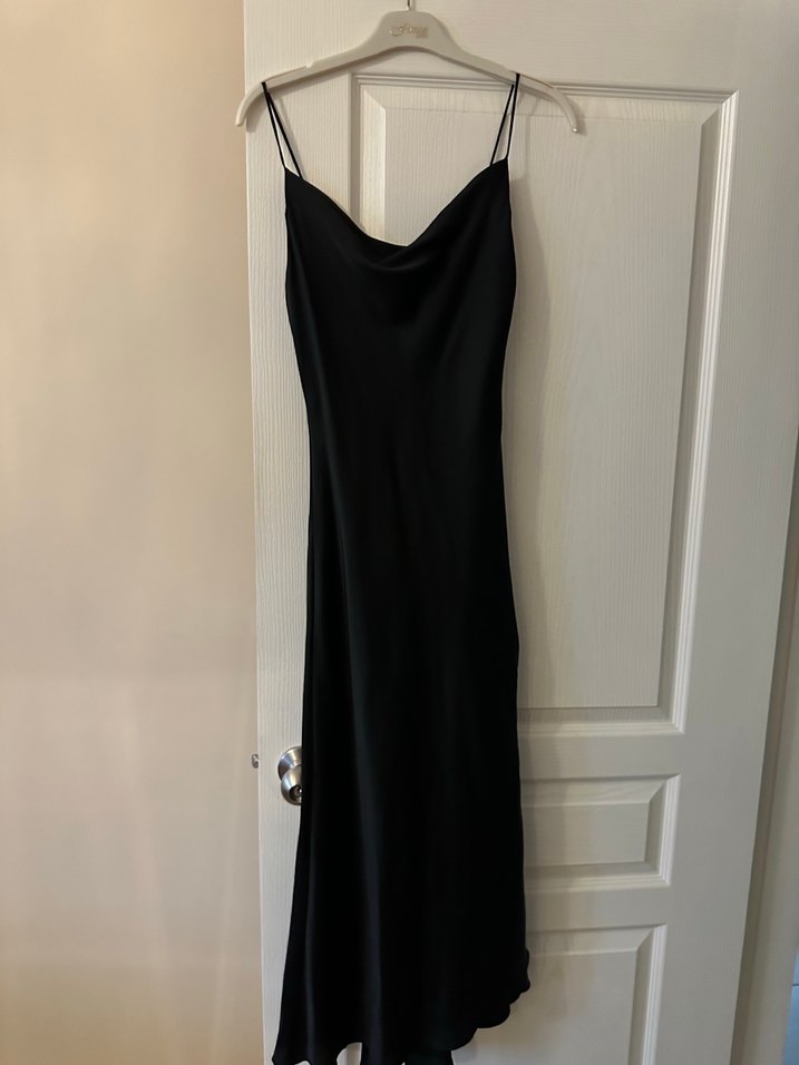 Siyah uzun elbise, drapeli tasarım ve V yakaya sahiptir. İnce kesimi ve ipeksi dokusuyla romantik akşamlar için uygundur.