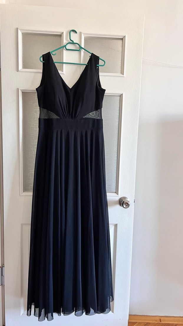 Siyah, uzun, drapeli ve V yakalı, kolsuz, klasik şıklıkta fitted kadın abiye elbise. Gotik tarzı yansıtır, düğün için uygun. Elbise üzerinde 4 numara beden yazıyor. 42 bedende giyilmiştir.