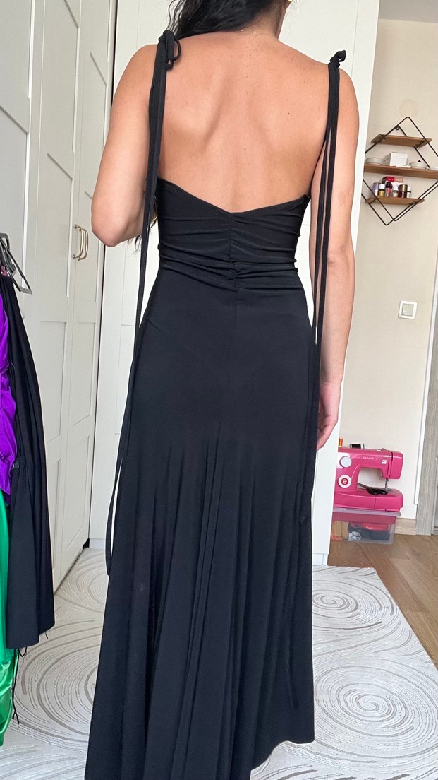 Drapeli tasarımı, askılı kolları ve V yakası ile siyah, uzun, vücuda oturan elbise. Pürüzsüz sentetik kumaştan, romantik akşamlar için ideal.