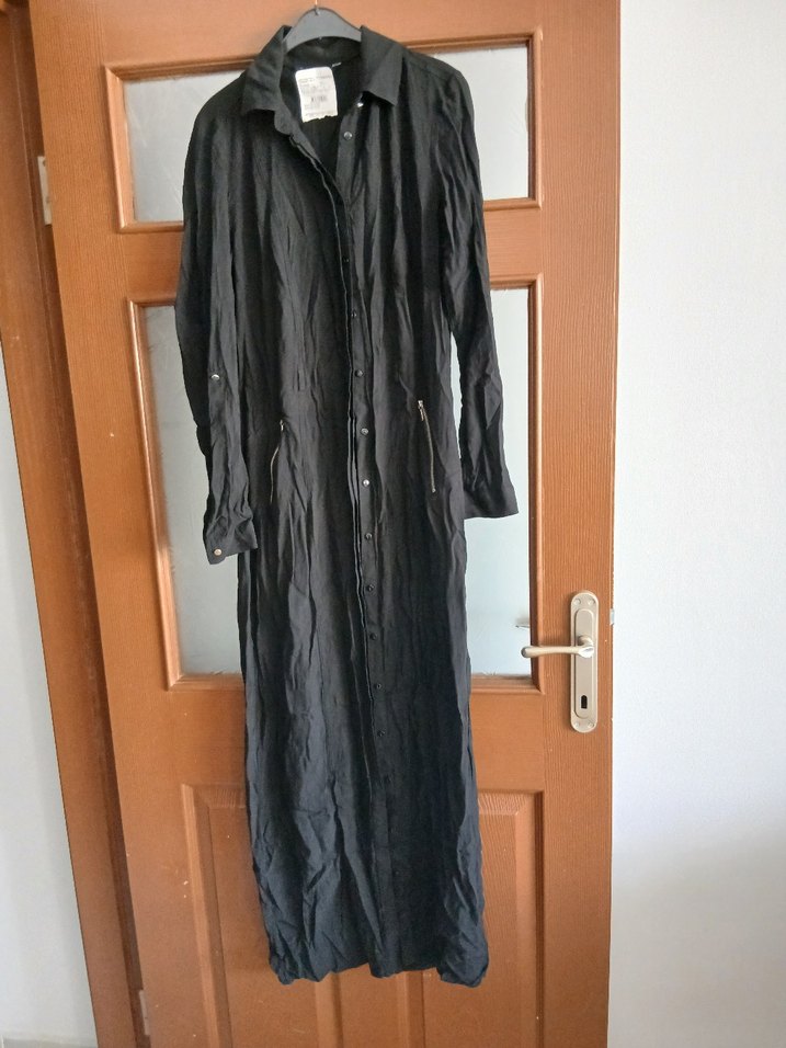 Siyah uzun keten elbise, bol kesim, uzun kollu ve yakalıdır. Drapeli tarzı bohem ve gotik görünüm sağlar. boydan düğmeli 36 beden etiketli cepli urun