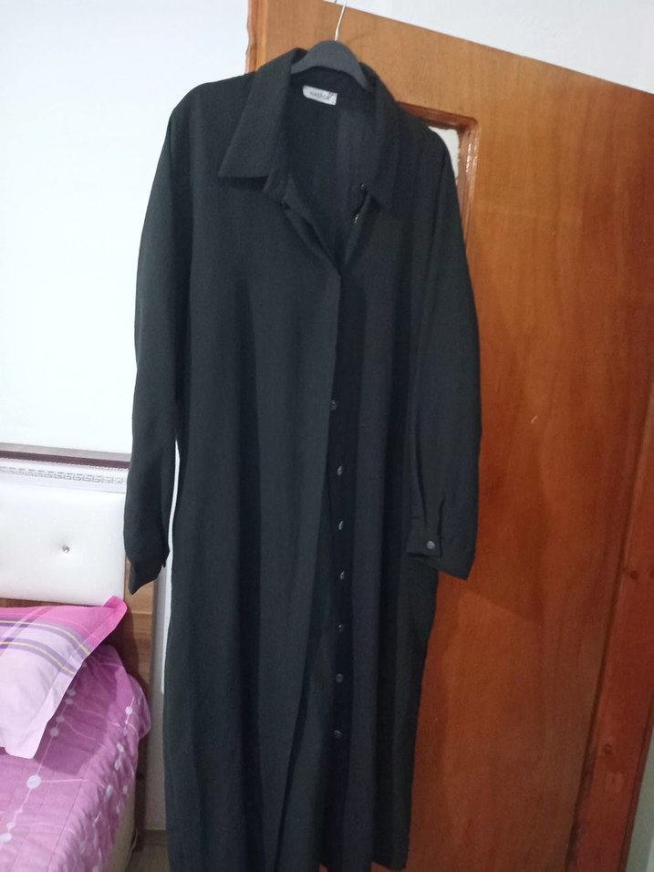 Siyah uzun, düğmeli kadın gömlek, bol kesim ve kesik yakaya sahiptir. Sentetik kumaştan, ofis için uygun, mütevazı gotik stil.