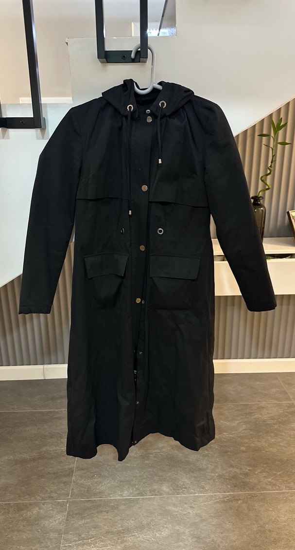 Siyah renkte, düğmeli uzun kadın kaban. Notlu yaka ve uzun kollu, sentetik kumaştan, günlük sokak stili için uygun. Dar kalıptır Boy115cm