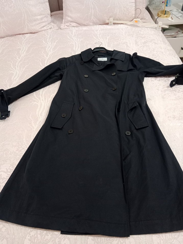 Siyah uzun kadın trençkot, düğmeli ve kesik yaka detaylıdır. Rahat kesimi ve uzun kolları ile günlük kullanıma uygundur.