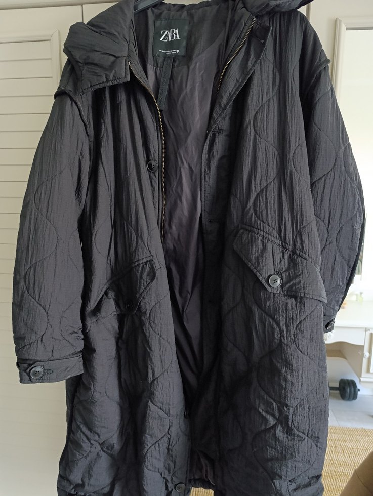 Düğmeli, kapitone siyah renkte uzun ve bol kesim mont. Notched lapel yakalı ve askılı kollu, rahat bir normcore tarz sunar.