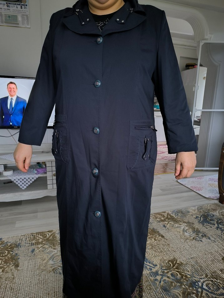 lacivert, düğmeli ve çıtçıtlı yakaya sahip. Uzun kollu, düzenli kesim ve fermuarlı cepler içerir, günlük kullanıma uygundur. sadece bir kez giyilmistir 54 bedendir