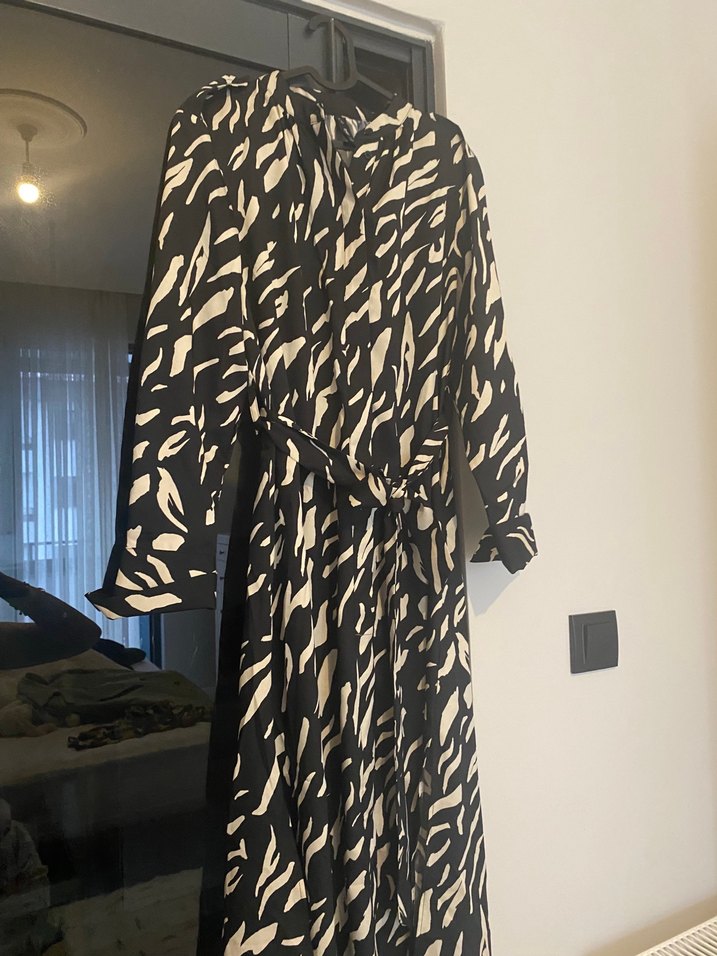 Siyah zebra desenli uzun elbise, bol kesim ve drapeli tasarıma sahip. Uzun kollu ve V yakalı, yumuşak sentetik kumaştan üretilmiştir. Kapalı giyime oldukça uygundur kol detayları vs cok hos görünüyor hiç giyilmedi hediye olarak geldi o sekilde duruyor #mango