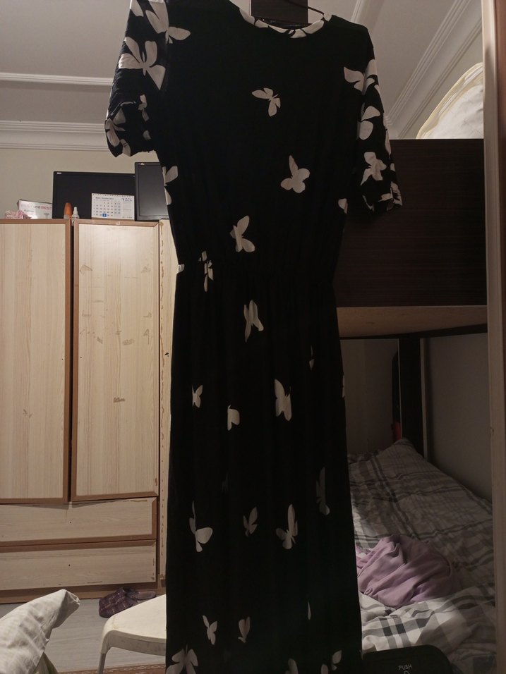 bedeni falan yok özel diktirmistik bir kere giyildi etek boyu 102 cm kısa kollu kelebek desenli