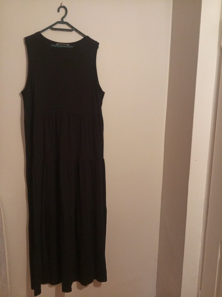 Siyah uzun elbise, bol kesim ve ipeksi kumaştan yapılmıştır. Minimalist goth tarzını yansıtır, günlük kullanıma uygundur.