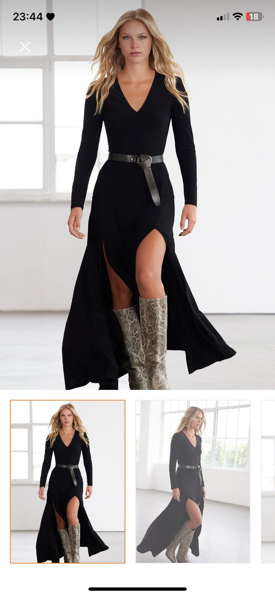 Siyah uzun elbise, V yaka ve ince askılı, Yan yırtmaçlarıyla şık ve iddialı bir görünüm sunar.