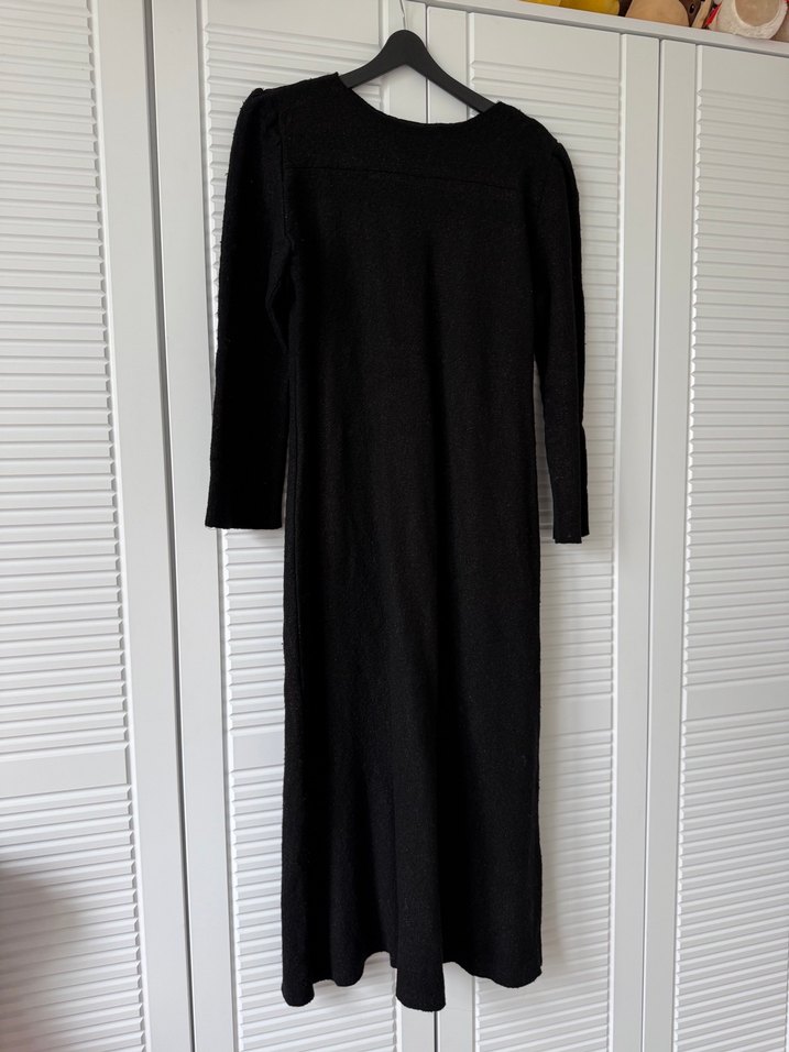 Uzun kolu, salaş ve drapeli kesimiyle siyah elbise. Yuvarlak yakalı, minimalist ve normcore tarzda günlük kullanıma uygun.
