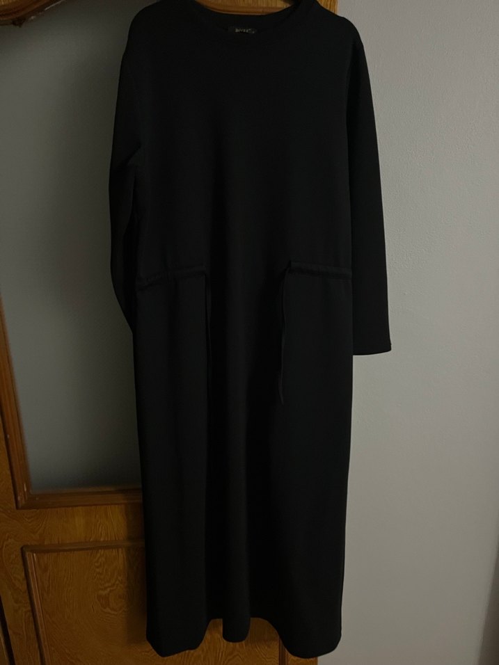 Uzun siyah elbise, salaş kesim ve drapeli detaylarla, uzun kollu ve yuvarlak yakalı, yumuşak ve sıcak kumaştan. Ofis için minimal bir stil sunar.