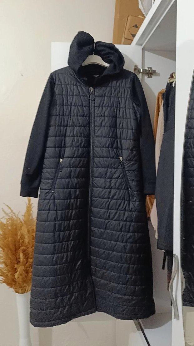 Siyah uzun kadın kaban, yüksek yakalı ve uzun kolludur. Fermuarlı ön ve cepleri bulunur. Rahat kesimli ve yumuşak kumaştan üretilmiştir.
