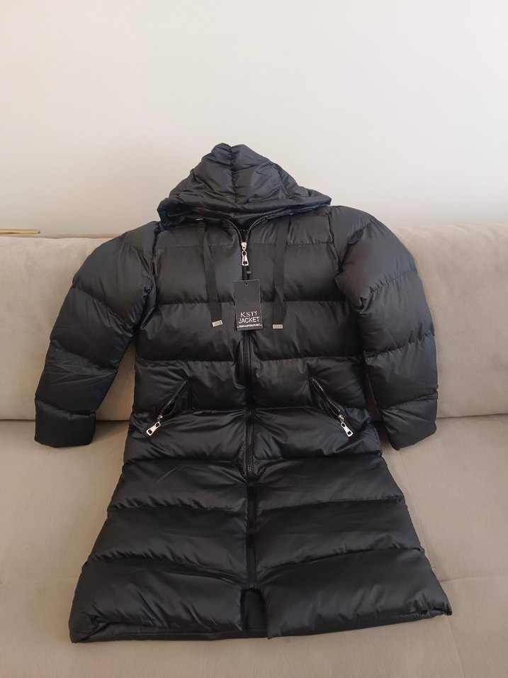 Siyah uzun fermuarlı kadın kışlık mont, kapüşonlu ve yumuşak sentetik kumaştan üretilmiştir. Notched lapel yakasıyla şık ve sokak stiline uygun. Kullanılmamış,etiketli